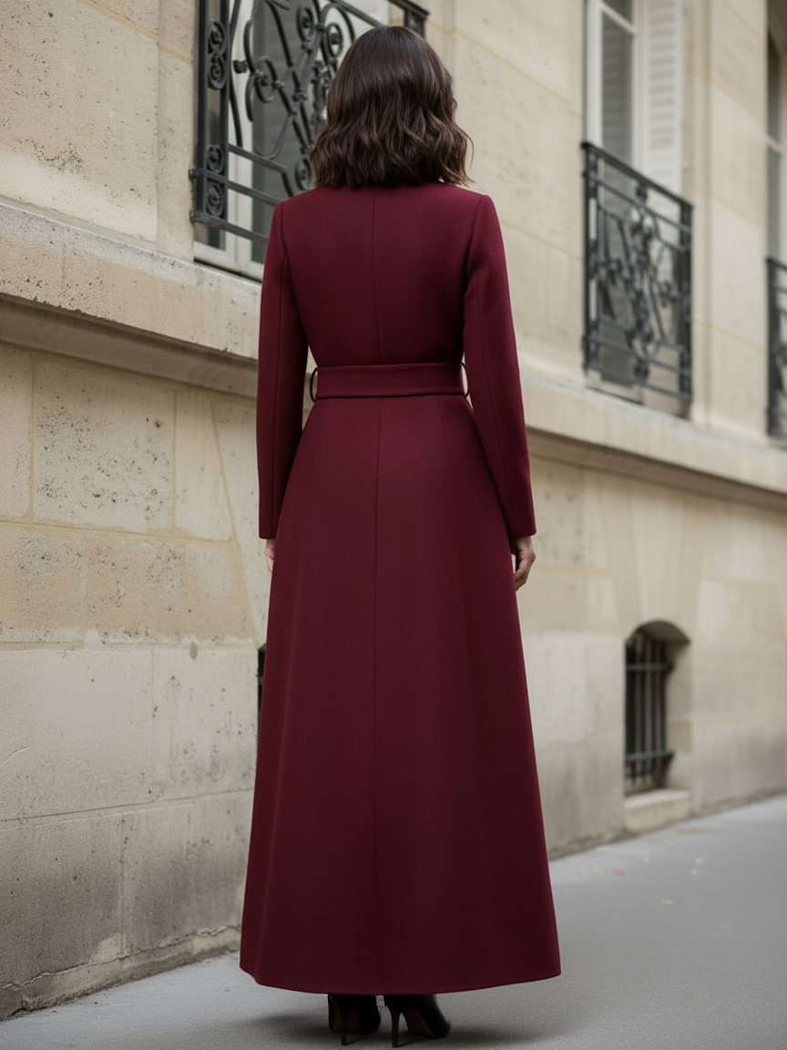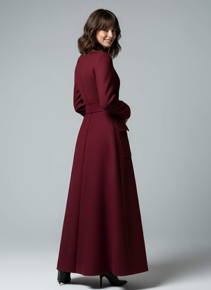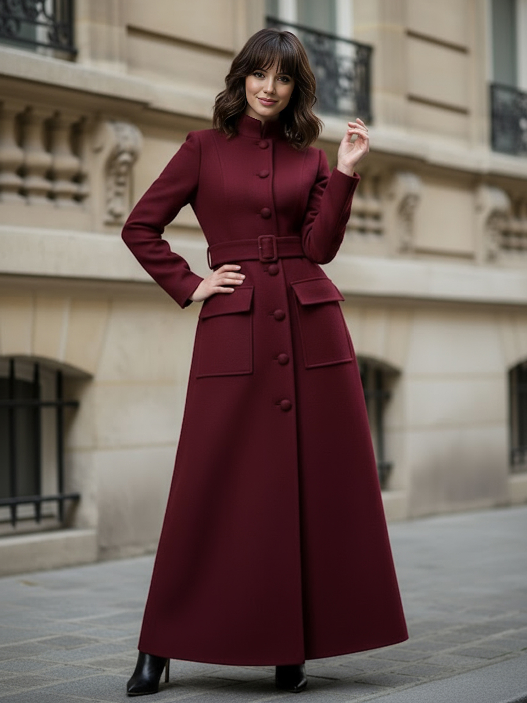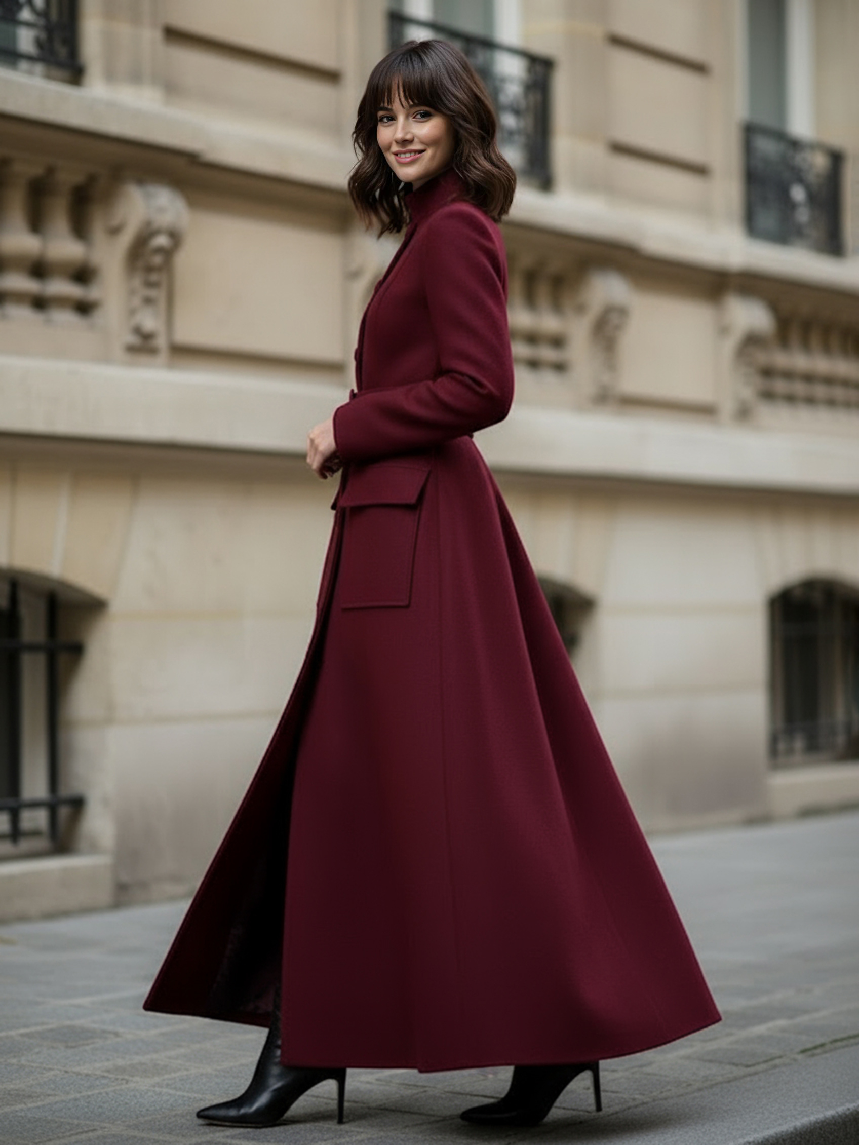 スタンドカラーとフラップポケット付きウールのフルレングスマキシコート(レディース)2025