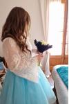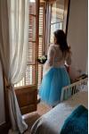 レビュー: ブルーのシンプルなウェディングドレスラインデザインのネックラインレースチュールブライダルガウン