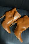 レビュー: ブラウンのハイヒールブーツ、つま先が尖ったデザインのバックルディテールアンクルブーツ