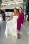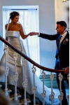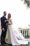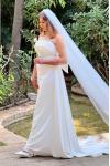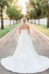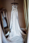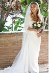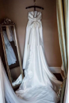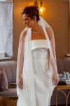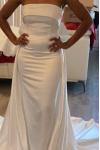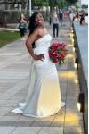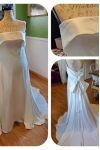 レビュー: アイボリーのシンプルなウェディングドレスサテン生地ストラップレスノースリーブ背中の開いた弓マーメイドブライダルガウン