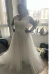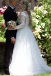 レビュー: アイボリーのシンプルなウェディングドレス、トレーン付き、Aライン、Vネック、長袖、背中開き、レース、ブライダルガウン、無料カスタマイズ