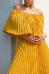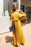 レビュー: マキシドレスハーフスリーブイエローバトーネックプリーツ非対称ポリエステル床丈ドレス