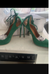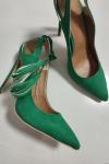 レビュー: 女性のハイヒールスチレットヒールパンプスマイクロスエードアッパーディープグリーンスリングバックヒール