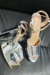 レビュー: 女性のためのセクシーなサンダル シルバー PU レザー オープントゥ チャンキーヒール スカイハイヒールサンダル