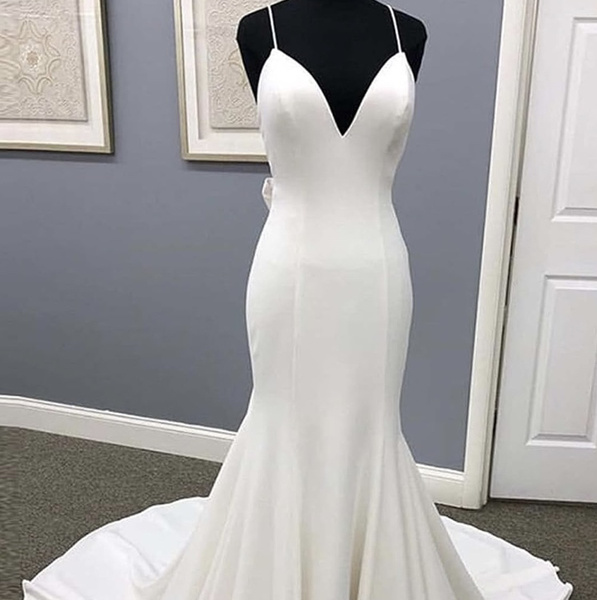 レビュー: ホワイトシンプルなカジュアルウェディングドレススパゲッティストラップサテン生地Vネックノースリーブフリルマーメイドブライダルドレス