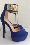 レビュー: 女性のセクシーなサンダルロイヤルブルーマイクロスエードアッパーオープントゥハイスティレットヒールアンクルストラップヒール