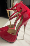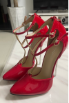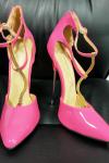 レビュー: レディースブラックハイヒールマゼンタポインテッドトゥスティレットヒールチェーンセクシーアンクルストラップヒール