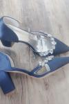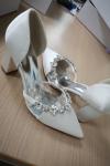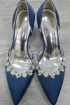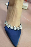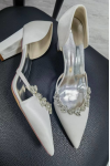 レビュー: 女性の結婚式の靴ラインストーンサテン先のとがったつま先チャンキーヒールブライダルシューズ