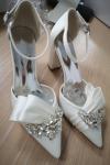 レビュー: 女性の結婚式の靴ラインストーンサテン先のとがったつま先チャンキーヒールブライダルシューズ